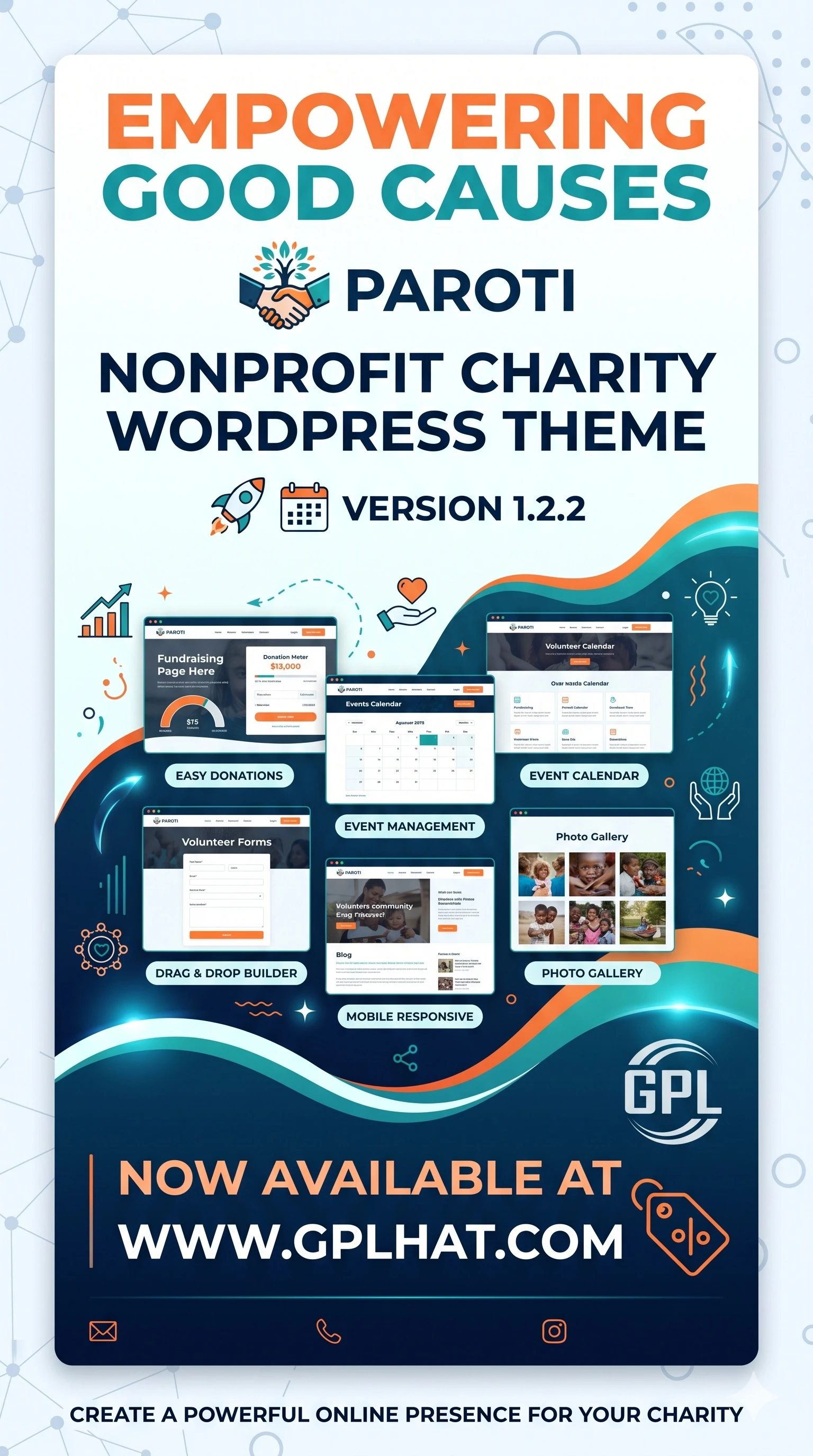 Paroti - Nonprofit Charity WordPress Theme v1.2.2 helps you create a professional website for charity and non-profit organizations. It includes multiple homepage layouts, campaign pages, donation sections, and event management features.